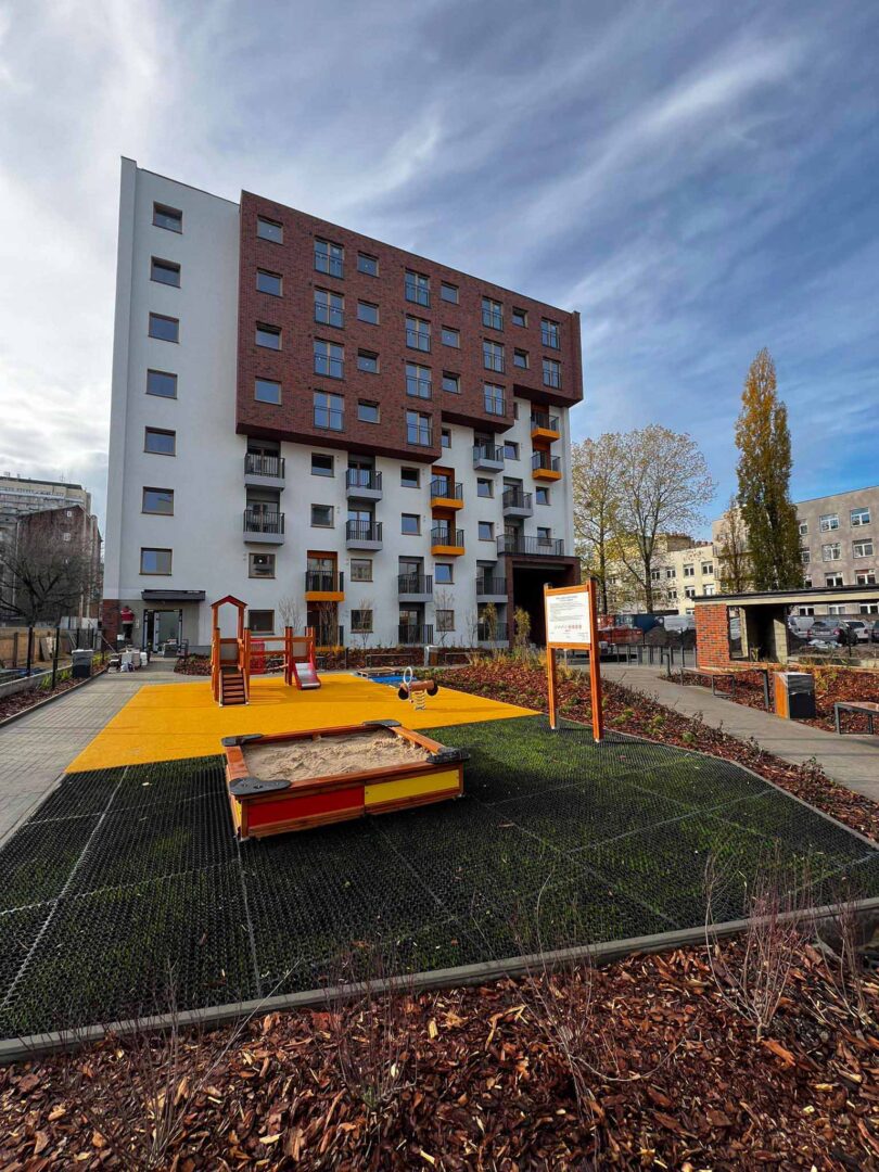 Obiekt został zaprojektowany w dwóch bryłach i posadowiony na płycie fundamentowej z jednopoziomowym garażem podziemnym w którym zlokalizowano 24 ładowarki do samochodów elektrycznych. Na inwestycji została zaprojektowana instalacja fotowoltaiczna zasilająca pompy ciepła umieszczone na dachu budynku. Zastosowanie instalacji fotowoltaicznej i pomp ciepłą pozwoli na funkcjonowanie budynku bez korzystania z zewnętrznej sieci cieplnej. Projektowane tereny zewnętrzne nawadniane będą z istniejących zbiorników retencyjnych pozwalających na odpowiednie nawodnienie terenów wokół placu zabaw i nie tylko. Nie mniej ciekawie wykończone zostały wnętrza budynku w których postawiono na styl loftowy czyli połączenie czarnych elementów drzwi, portali windowych i szachtów z bielą ścian i fragmentami imitacji cegieł nawiązującymi do elewacji budynku.