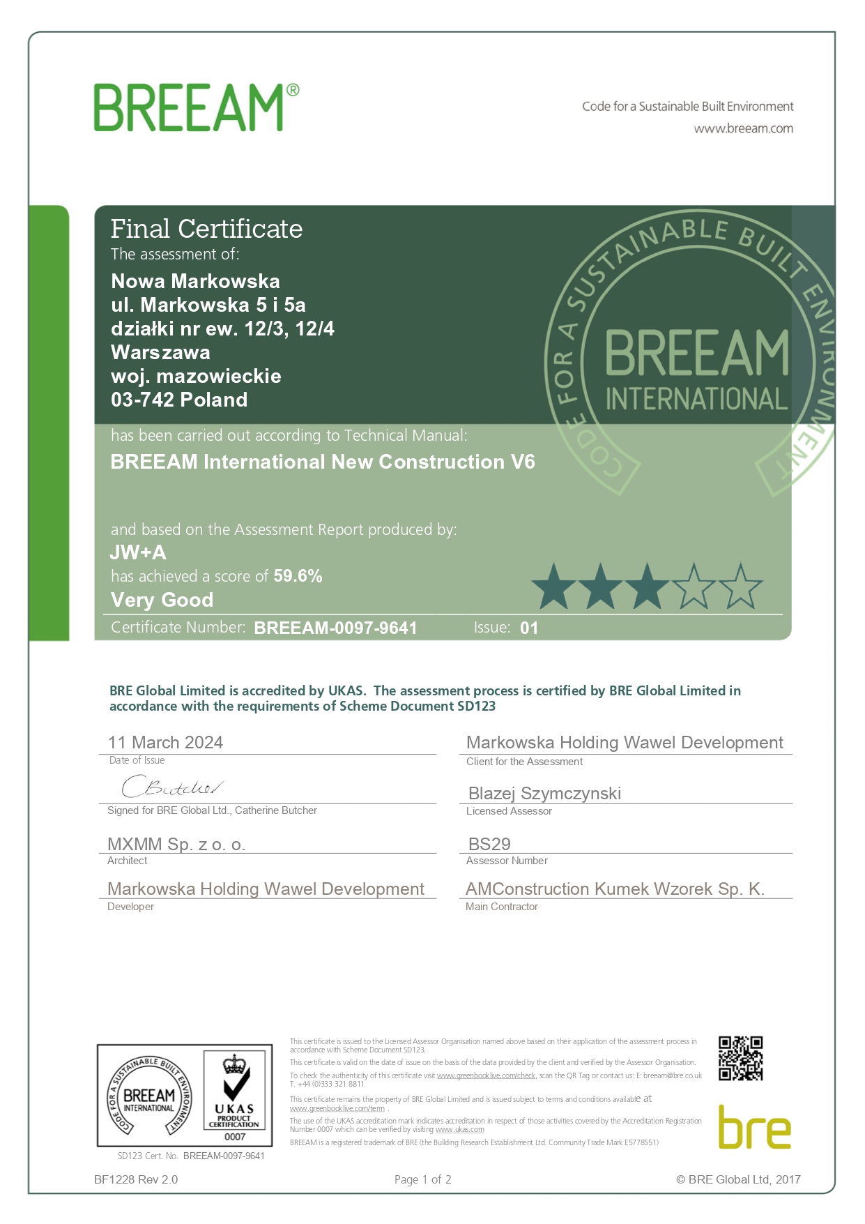 Inwestycja „Nowa Markowska” zlokalizowana jest na warszawskiej Starej Pradze przy ulicy Markowskiej 5. Projekt charakteryzuje się połączeniem modernistycznej bryły budynku z okładziną fasadową z Elastholitu wpasowującą się w lokalną architekturę ceglanych kamienic z wyraźnymi akcentami pomarańczu, które pozwalają na wyeksponowanie budynku wśród pobliskiej zabudowy. Inwestycja będzie realizowana w oparciu o politykę zarządzania uwzględniającą zasady niezbędne do otrzymania certyfikatu BREEAM.